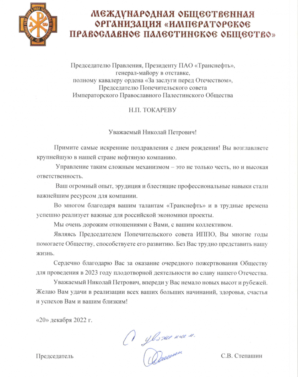 Председатель ИППО Сергей Степашин тепло поздравил Николая Петровича с днём рождения, поблагодарив за поддержку деятельности старейшей в России Международной общественной организации «Императорское Православное Палестинское Общество». Сергей Степашин пожелал успехов в многотрудной деятельности, крепкого здоровья и благополучия в семье.