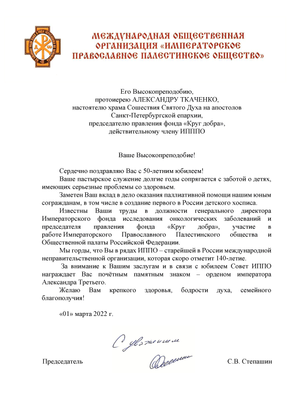 Поздравлением случаю юбилея в адрес действительного члена ИППО направил Председатель Императорского Православного Палестинского Общества Сергей Степашин.