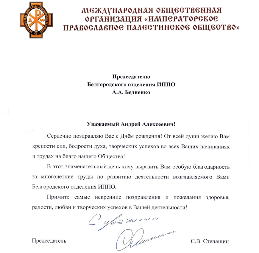 28 декабря Председатель Императорского Православного Палестинского Общества поздравил с днём рождения руководителя Белгородского отделения Общества Андрея Бедненко.