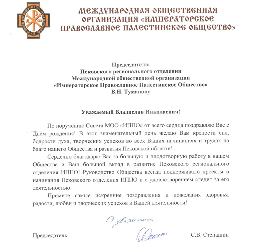 Председатель ИППО Сергей Степашин направил поздравление в адрес Владислава Николаевича. В нём говорится: