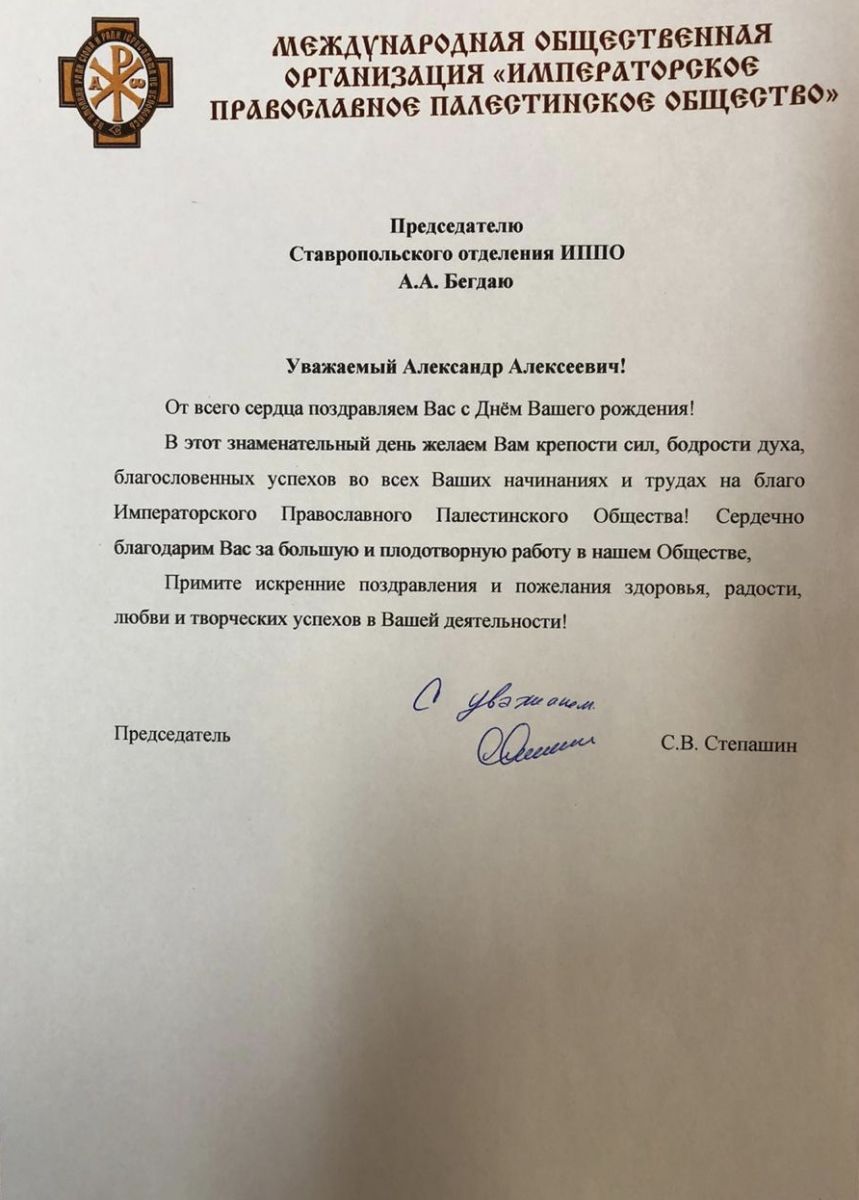 20 апреля Председатель Императорского Православного Палестинского Общества Сергей Степашин поздравил с днём рождения руководителя Ставропольского отделения ИППО Александра Бегдая.
