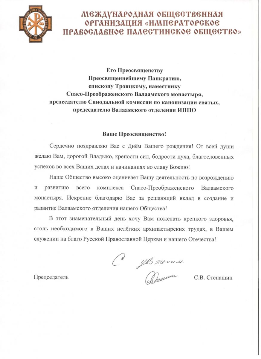 21 июля Председатель ИППО Сергей Степашин поздравил с днём рождения руководителя Валаамского отделения ИППО, викария Святейшего Патриарха Московского и всея Руси Кирилла, наместника Спасо-Преображенского Валаамского ставропигиального мужского монастыря, председателя Синодальной комиссии по канонизации святых епископа Троицкого Панкратия.