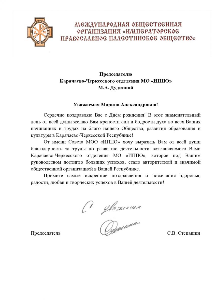 8 сентября Председатель ИППО Сергей Степашин поздравил с днём рождения руководителя Карачаево-Черкесского отделения Общества Марину Дудкину.