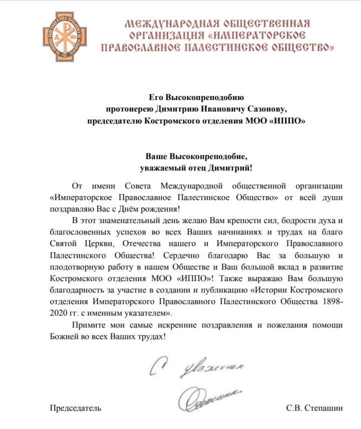 12 сентября Председатель ИППО Сергей Степашин поздравил с днём рождения руководителя Костромского отделения Общества протоиерея Димитрия Сазонова.