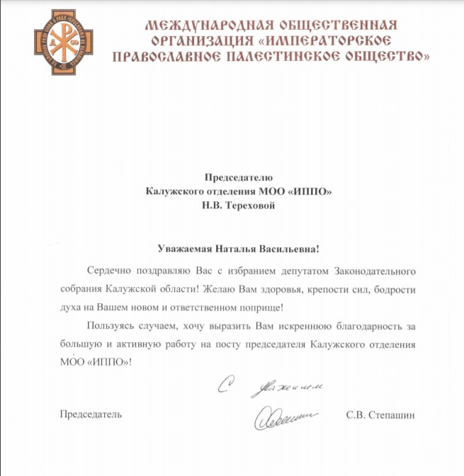 Председатель ИППО Сергей Степашин поздравил руководителя Калужского отделения ИППО Наталью Терехову с избранием депутатом Законодательного собрания Калужской области.
