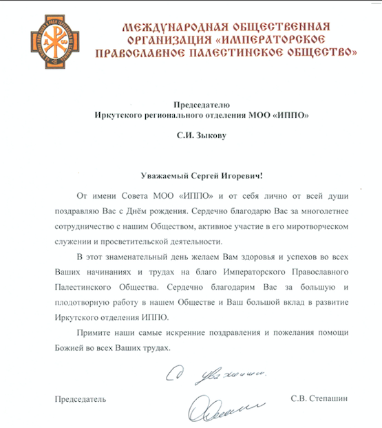 В этот знаменательный день желаем Вам здоровья и успехов во всех Ваших начинаниях и трудах на благо Императорского Православного Палестинского Общества!