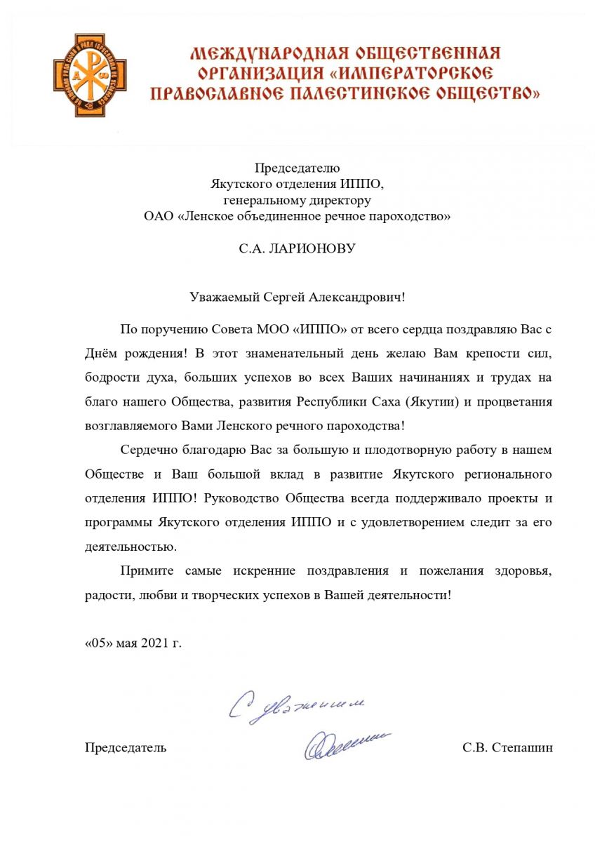 5 мая день рождения отмечает руководитель Якутского отделения ИППО, генеральный директор ОАО «Ленское объединенное речное пароходство» Сергей Ларионов.