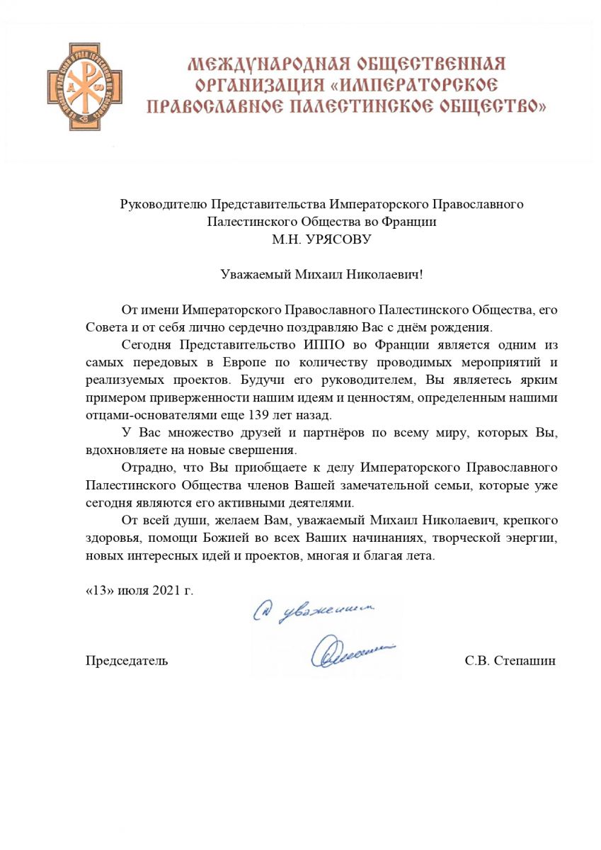 Поздравление в адрес Михаила Николаевича направил Председатель Императорского Православного Палестинского Общества Сергей Степашин.