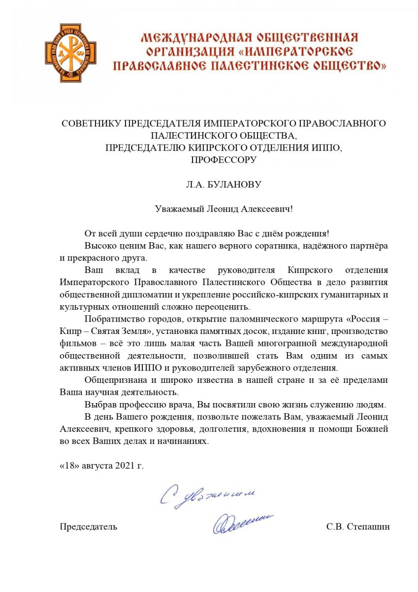 Поздравление в адрес Леонида Алексеевича направил Председатель Императорского Православного Палестинского Общества Сергей Степашин.