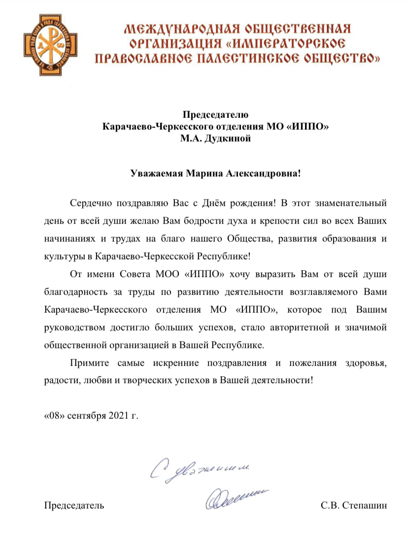 8 сентября Председатель ИППО Сергей Степашин поздравил с днём рождения руководителя Карачаево-Черкесского отделения Общества Марину Дудкину.