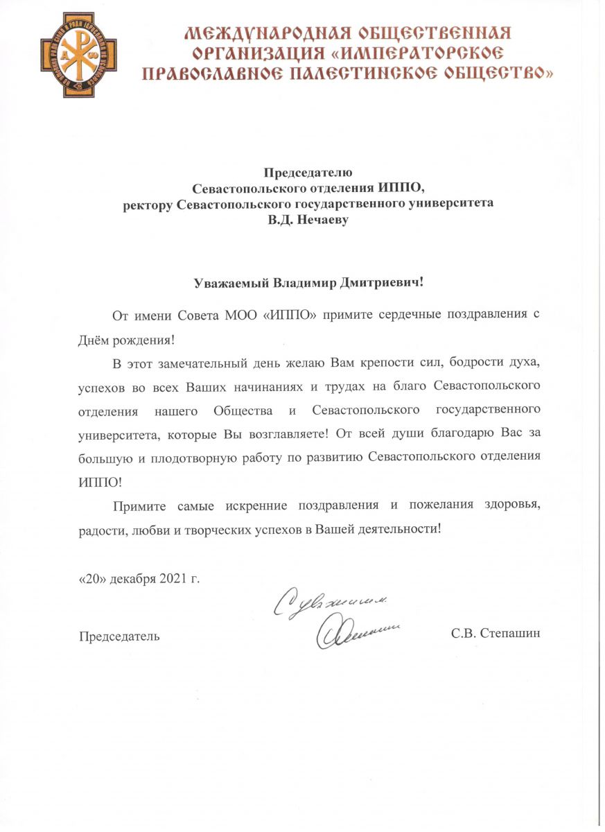 Председатель Императорского Православного Палестинского Общества Сергей Степашин поздравил с днём рождения ректора Севастопольского государственного университета, руководителя Севастопольского отделения ИППО Владимира Нечаева.