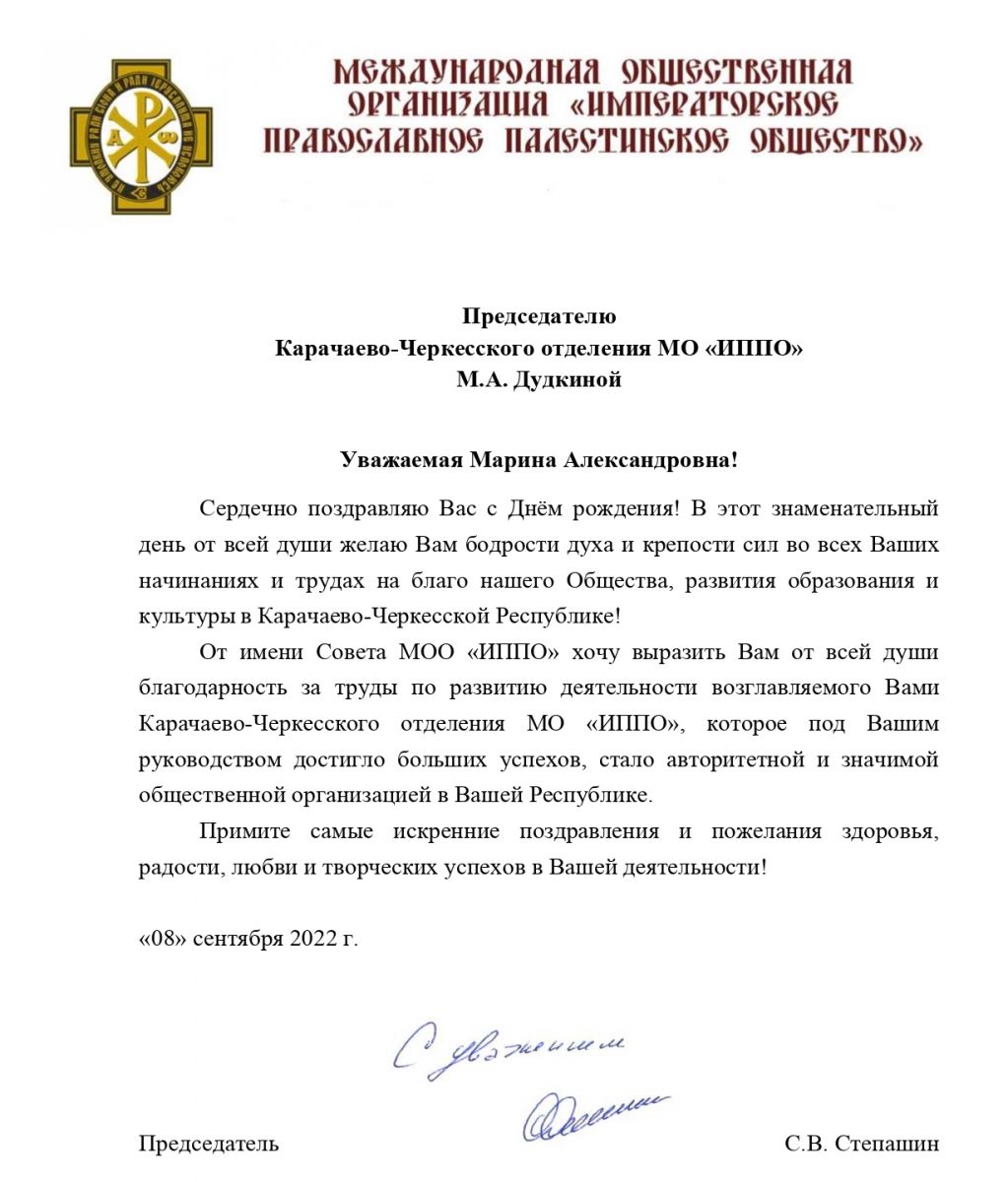 8 сентября день рождения отмечает руководитель регионального отделения Императорского Православного Палестинского Общества в Карачаево-Черкесской Республике Марина Дудкина.