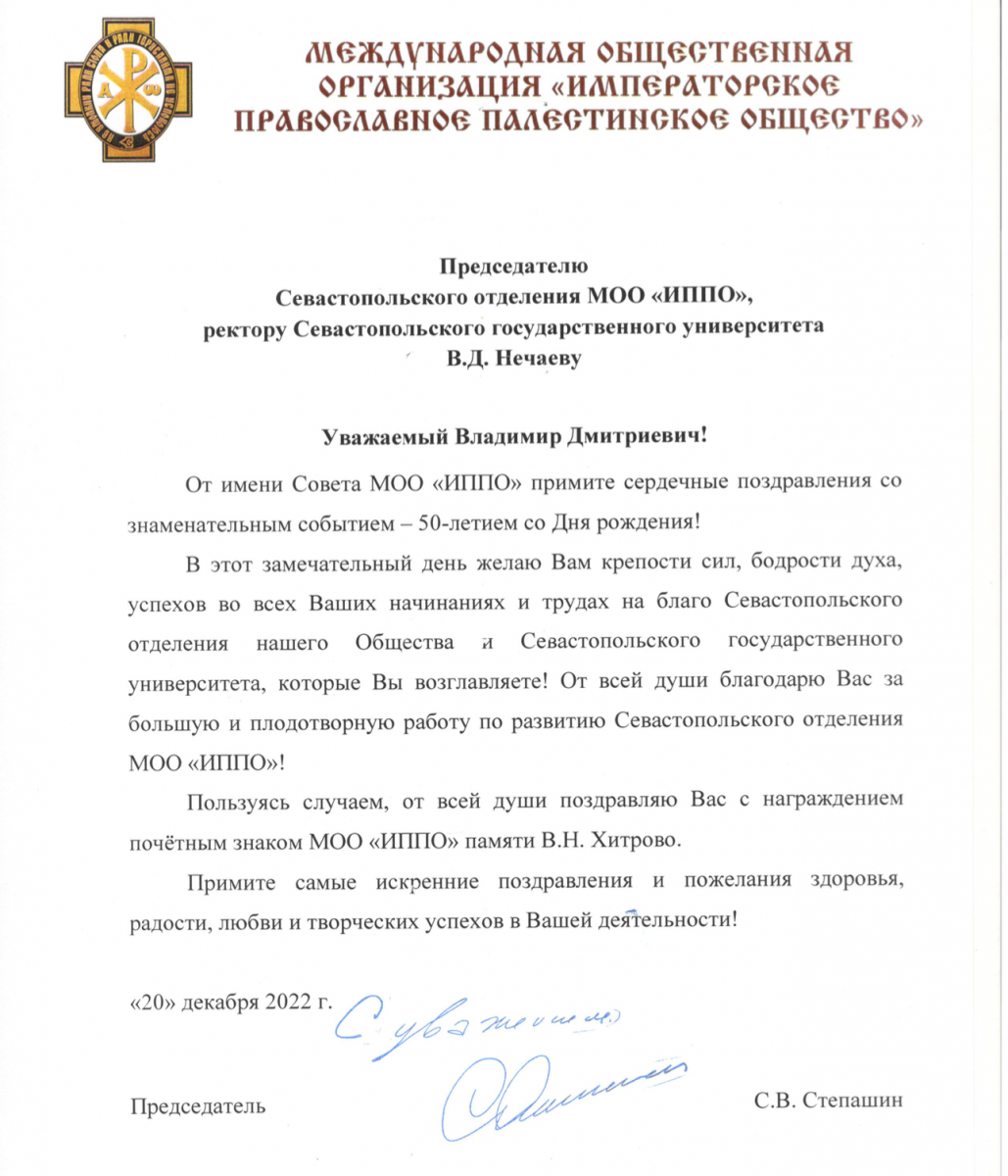 Поздравление в адрес Владимира Дмитриевича направил Председатель Императорского Православного Палестинского Общества Сергей Степашин.