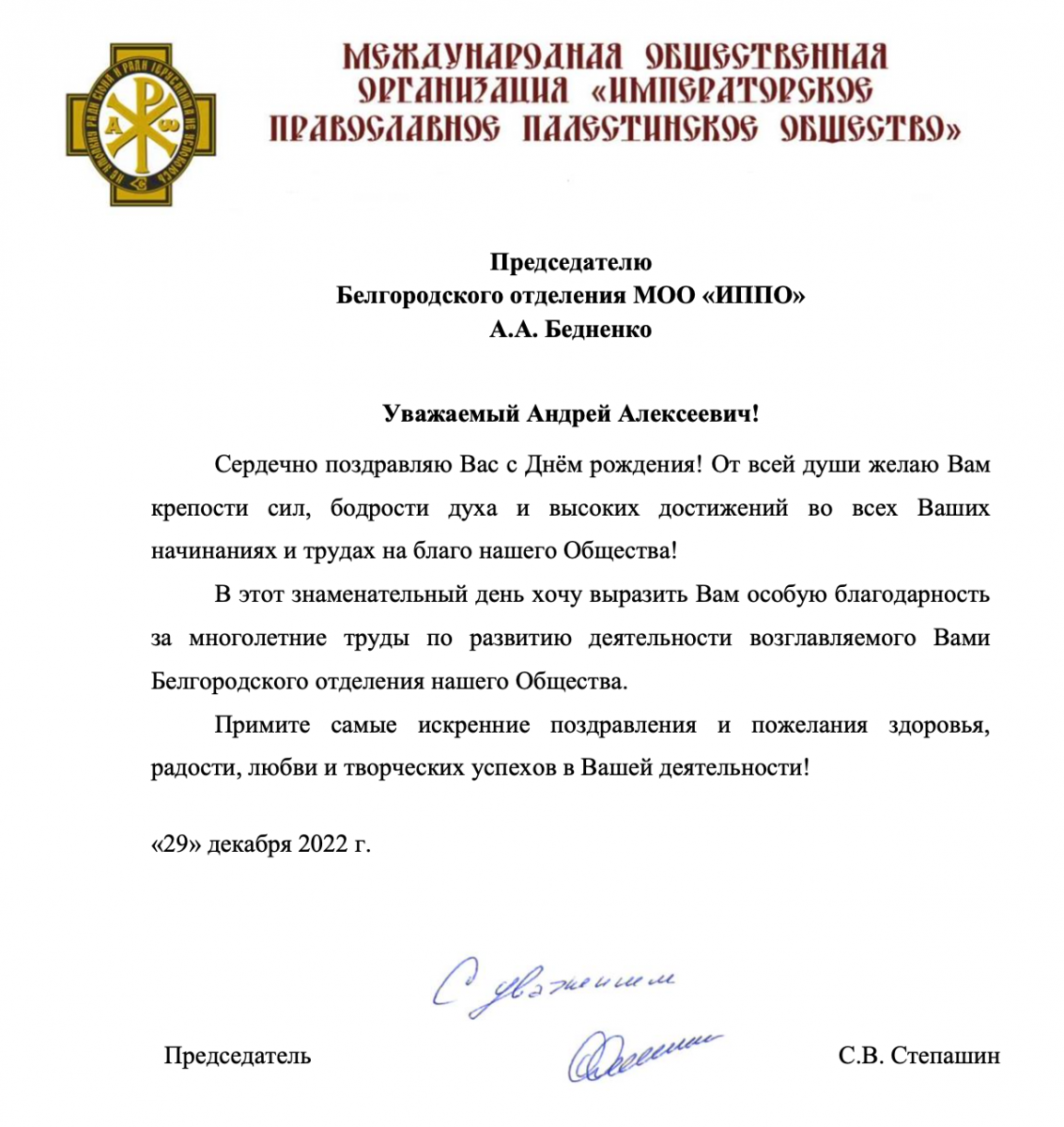 Поздравление в адрес руководителя регионального отделения направил Председатель Императорского Православного Палестинского Общества Сергей Степашин.