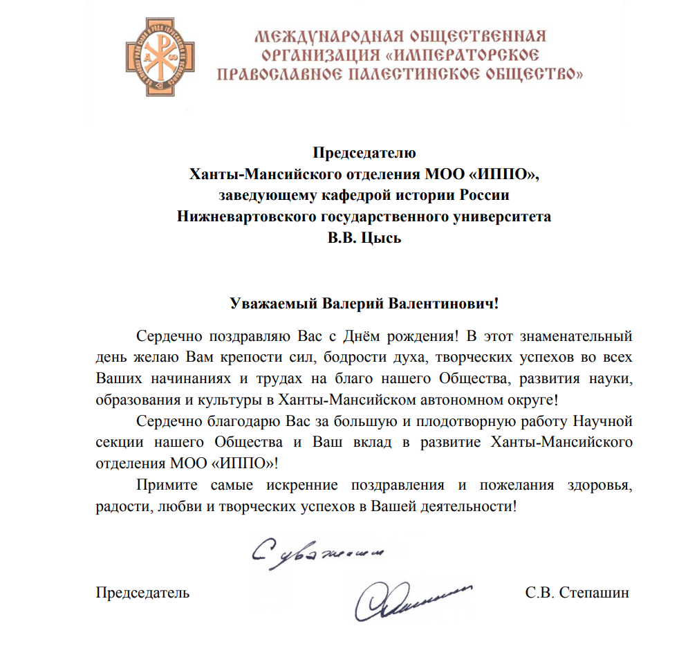 Поздравление в адрес руководителя регионального отделения направил Председатель Императорского Православного Палестинского Общества Сергей Степашин.