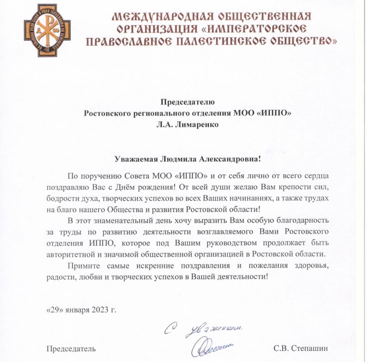 29 января день рождения отмечает руководитель Ростовского отделения Императорского Православного Палестинского Общества Людмила Лимаренко.