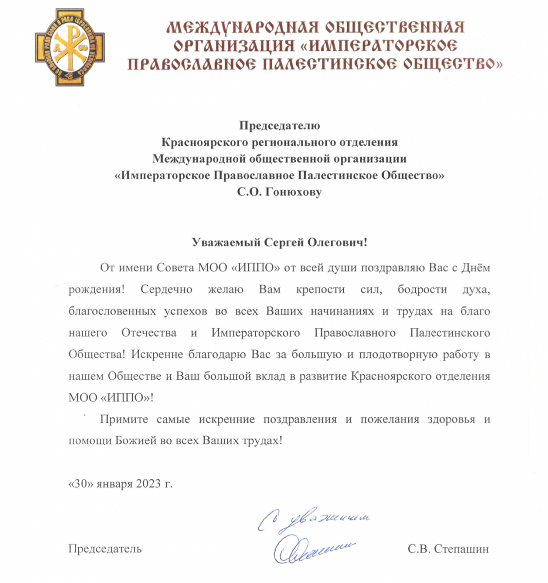 30 января 2023 года Председатель ИППО Сергей Степашин поздравил с днём рождения руководителя Красноярского отделения Общества Сергея Гонюхова.