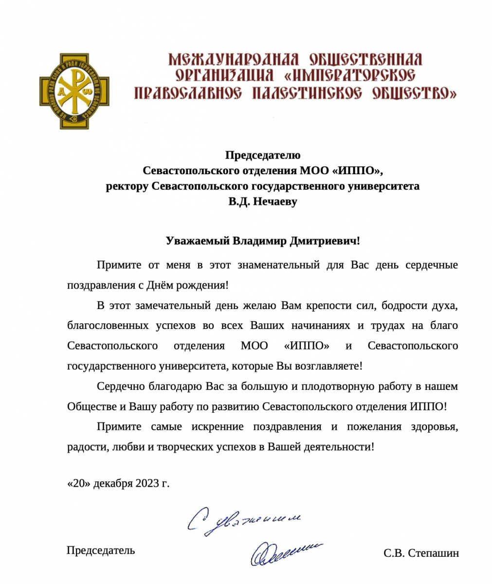 Поздравление в адрес Владимира Дмитриевича направил Председатель Императорского Православного Палестинского Общества Сергей Степашин.