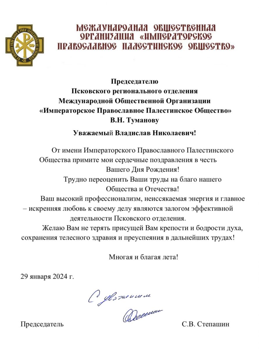 29 января день рождения отмечает руководитель Псковского отделения Императорского Православного Палестинского Общества Владислав Туманов.