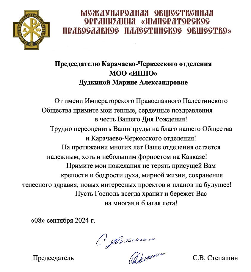 8 сентября день рождения отмечает руководитель регионального отделения Императорского Православного Палестинского Общества в Карачаево-Черкесской Республике Марина Дудкина.