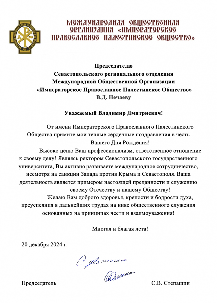 Поздравление в адрес Владимира Дмитриевича направил Председатель Императорского Православного Палестинского Общества Сергей Степашин: