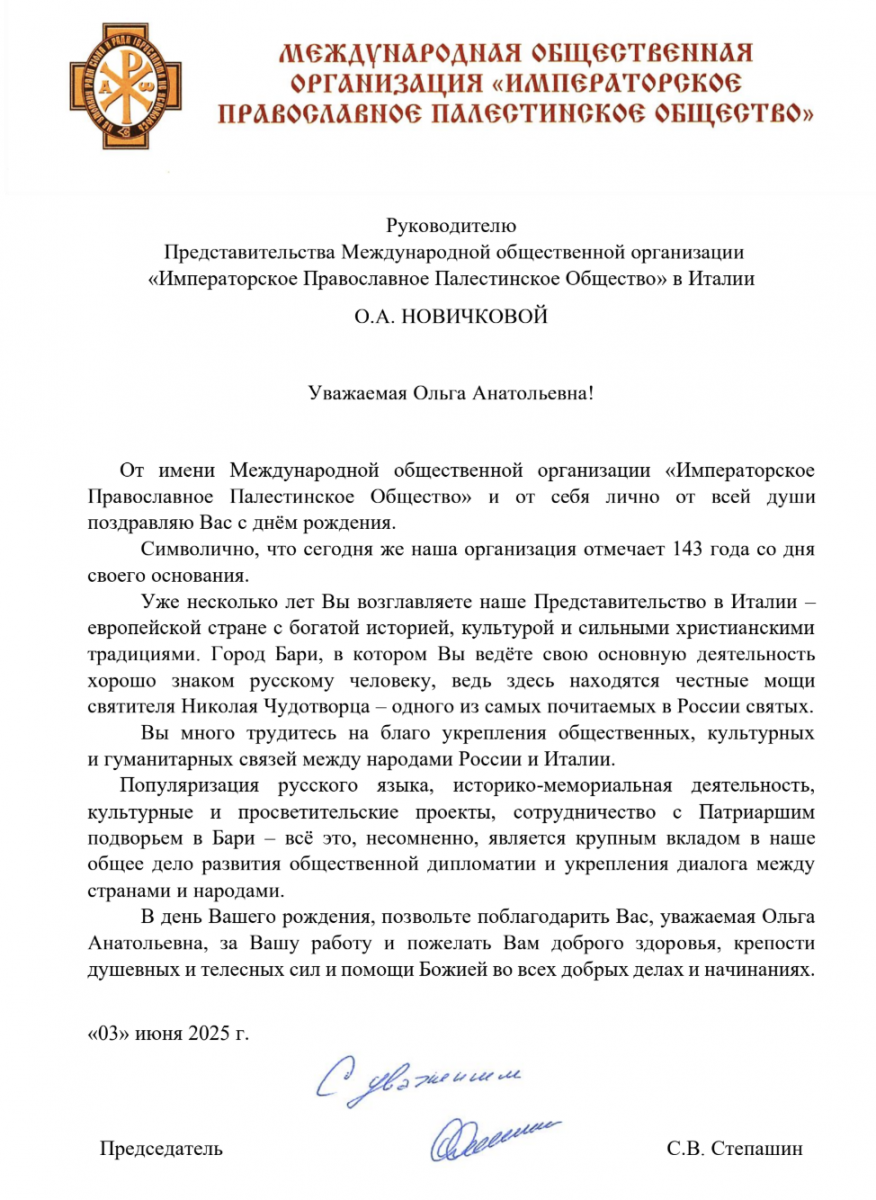 Сергей Степашин поздравил с днём рождения руководителя Представительства ИППО в Италии Ольгу Новичкову