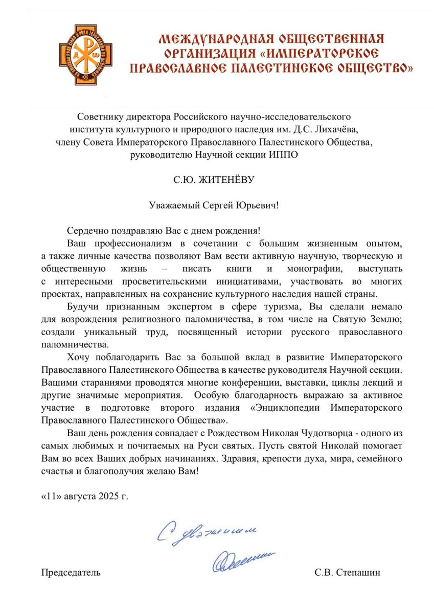 11 августа день рождения отмечает руководитель Научной секции Общества, член Совета ИППО, советник директора Российского НИИ культурного и природного наследия им. Д.С.Лихачёва Сергей Житенёв. Поздравление в адрес Сергея Юрьевича направил Председатель Общества Сергей Степашин.