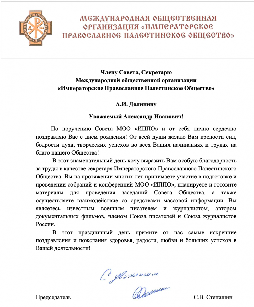 17 ноября день рождения отмечает член Совета ИППО и секретарь Императорского Православного Палестинского Общества Александр Долинин.