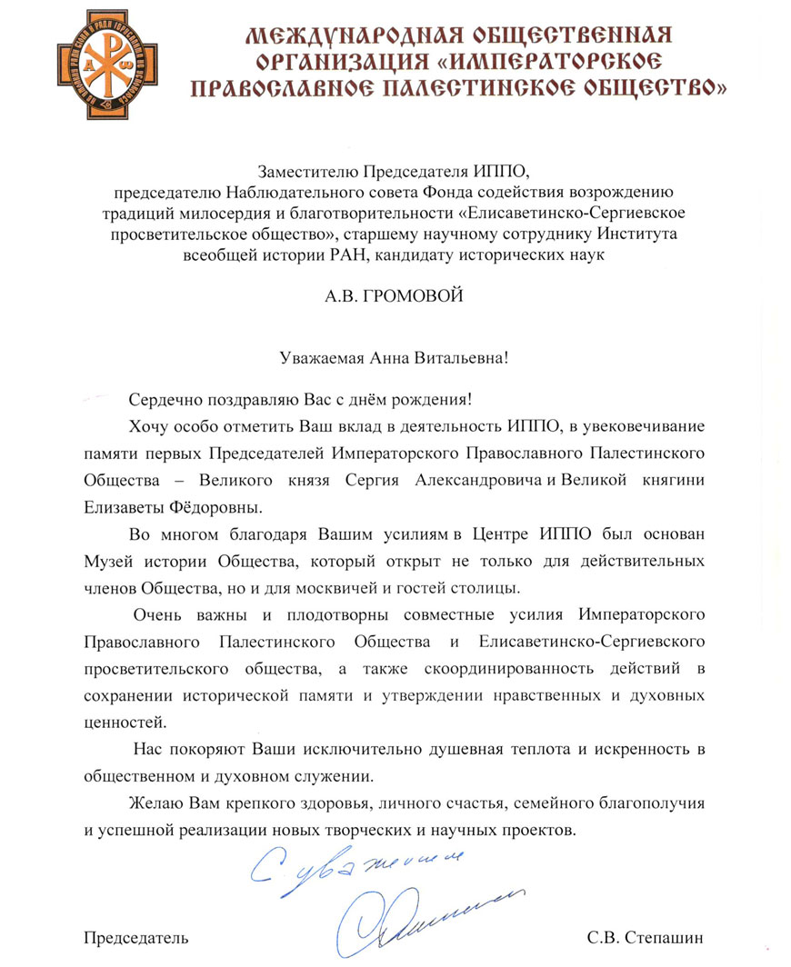 Сегодня день рождения у заместителя Председателя ИППО, председателя Наблюдательного совета Фонда содействия возрождению традиций милосердия и благотворительности «Елисаветинско-Сергиевское просветительское общество», старшего научного сотрудника Института всеобщей истории РАН, кандидата исторических наук Анны Громовой. Сергей Степашин поздравил Анну Витальевну с днём рождения.