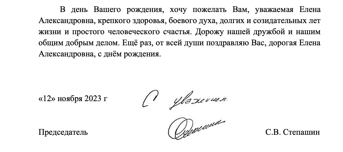 Поздравление в адрес Елены Александровны направил Председатель ИППО Сергей Степашин.
