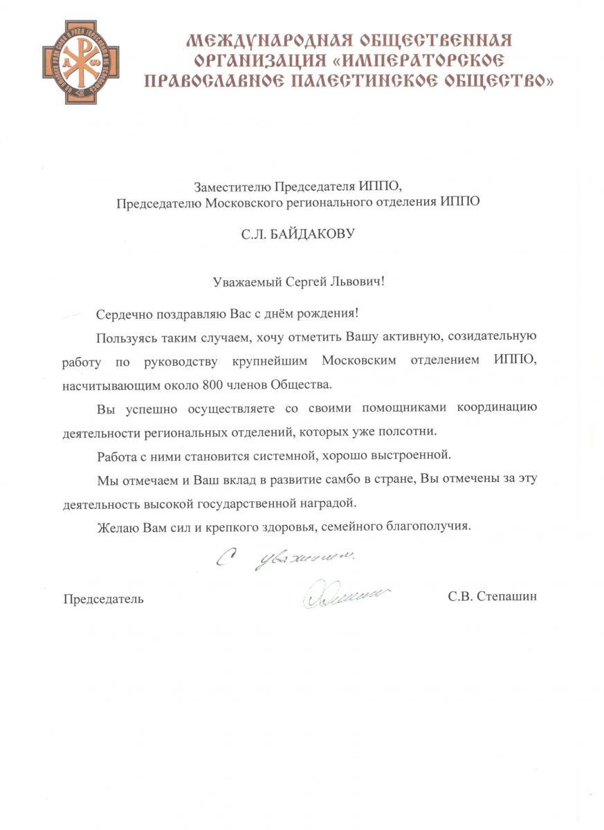 Сегодня день рождения заместителя Председателя ИППО, члена Совета Общества, руководителя Московского регионального отделения ИППО Сергея Байдакова. Председатель Императорского Православного Палестинского Общества Сергей Степашин поздравил Сергея Львовича с днём рождения.