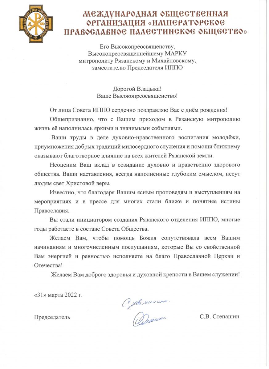Поздравление в адрес владыки Марка направил Председатель ИППО Сергей Степашин: