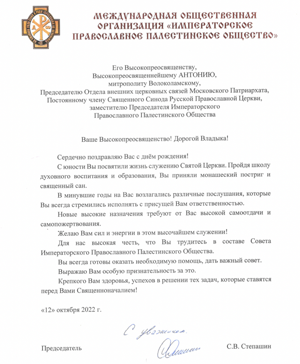 Поздравление в адрес владыки Антония направил Председатель ИППО Сергей Степашин.