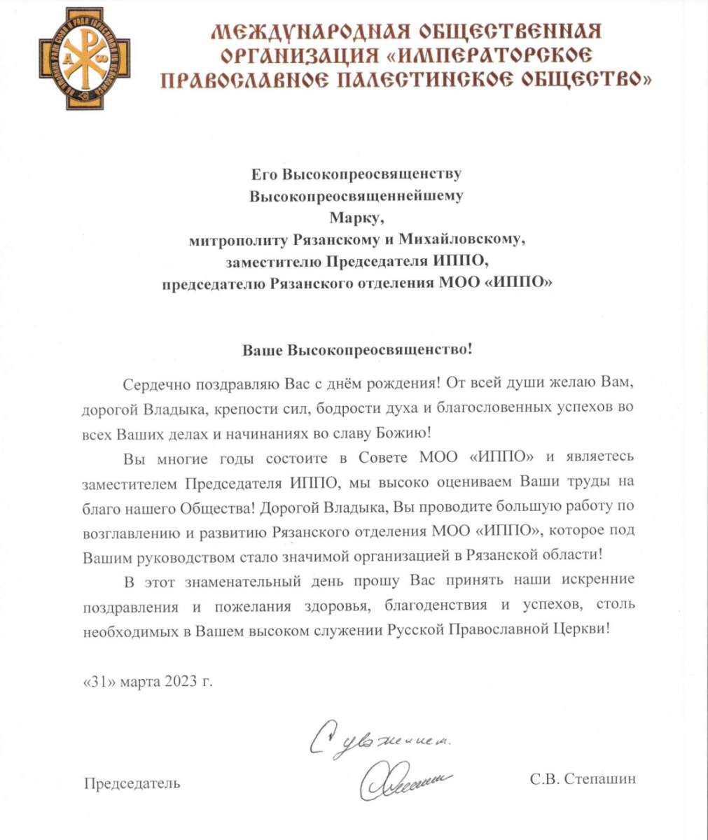 31 марта день рождения отмечает заместитель Председателя ИППО, руководитель Рязанского отделения Общества митрополит Рязанский и Михайловский Марк.