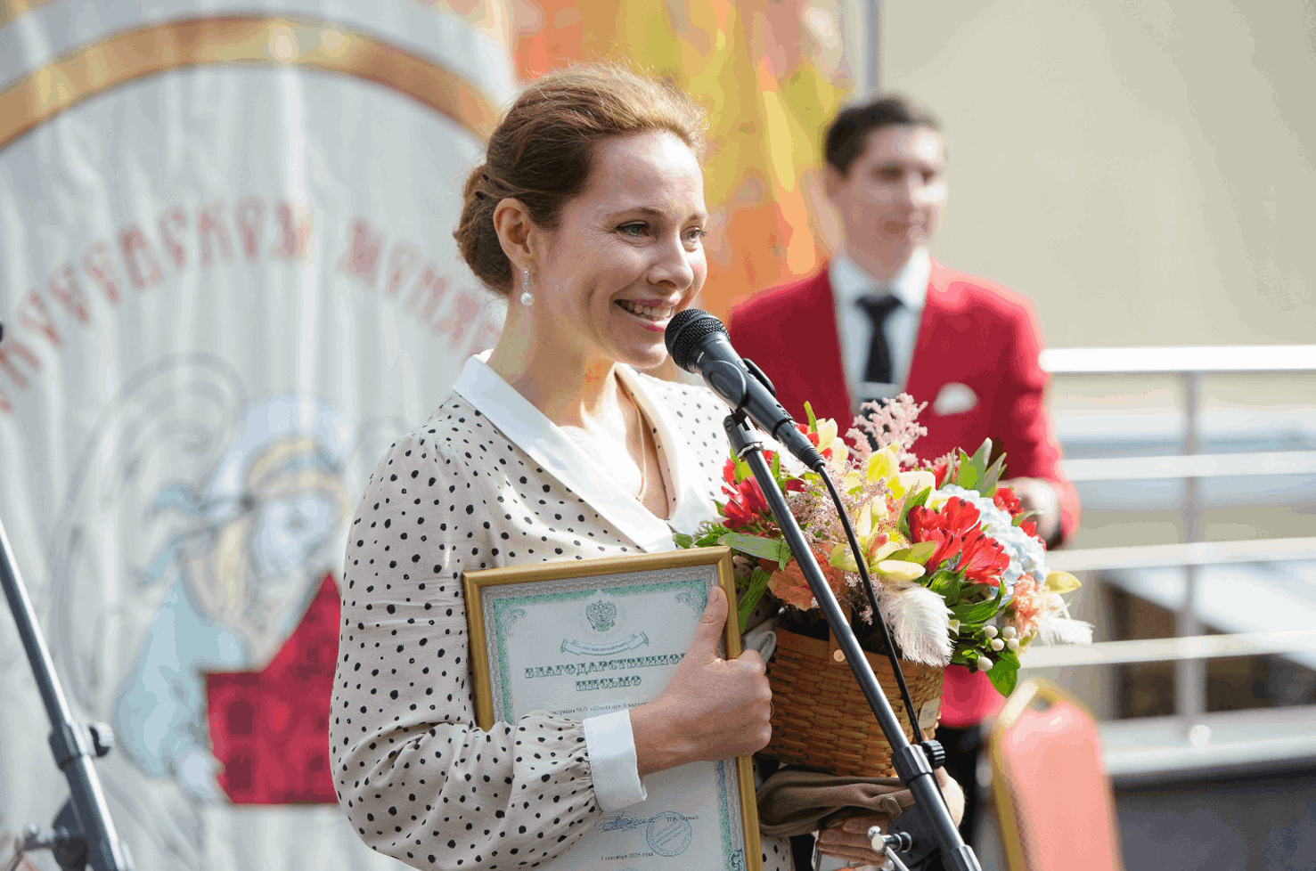 От родителей слово было предоставлено заслуженной артистке России Екатерине Гусевой, ее дочка в прошлом году перешла в Алексеевскую школу: «Мы счастливы, что наши дети находятся под покровом Божьей матери, под крылом игумении Ксении, под присмотром Николь Валентиновны и наших добрых наставников. Наши родительские сердца спокойны. Мы знаем, что наши детки в надёжных любящих руках».
