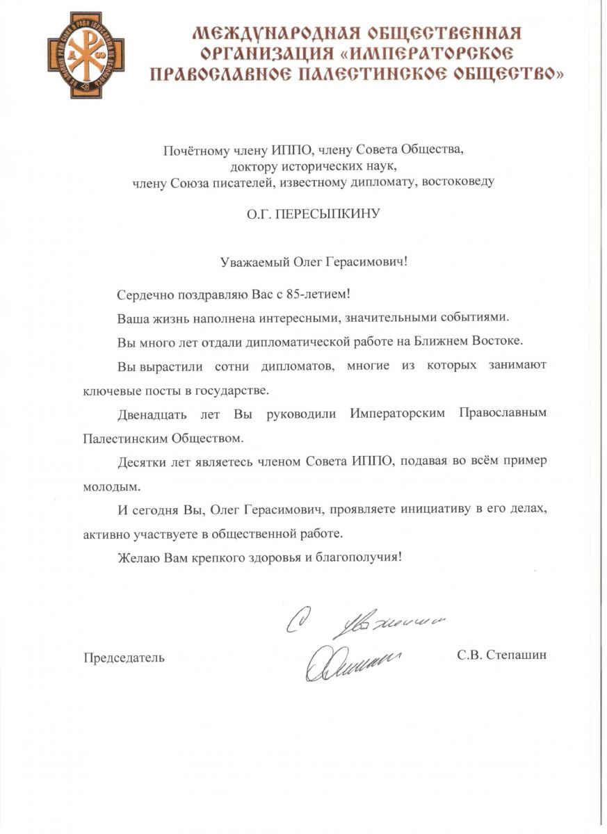 12 августа 2020 года Почётный член ИППО, член Совета Общества, Чрезвычайный и Полномочный Посол, учёный-востоковед, член Союза писателей России, председатель Российского общества дружбы, делового и культурного сотрудничества с Ливаном, доктор исторических наук профессор Олег Пересыпкин отмечает 85-летие.