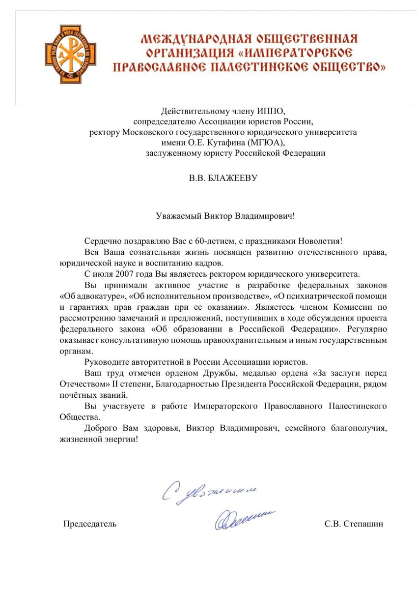 Председатель Императорского Православного Палестинского Общества Сергей Степашин поздравил Виктора Владимировича с юбилеем.