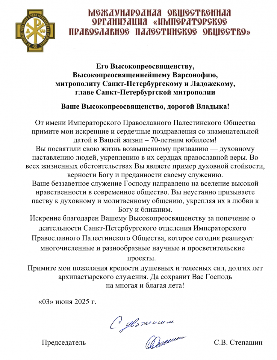 Поздравления в адрес владыки по случаю 70-летия направил Председатель ИППО Сергей Степашин: