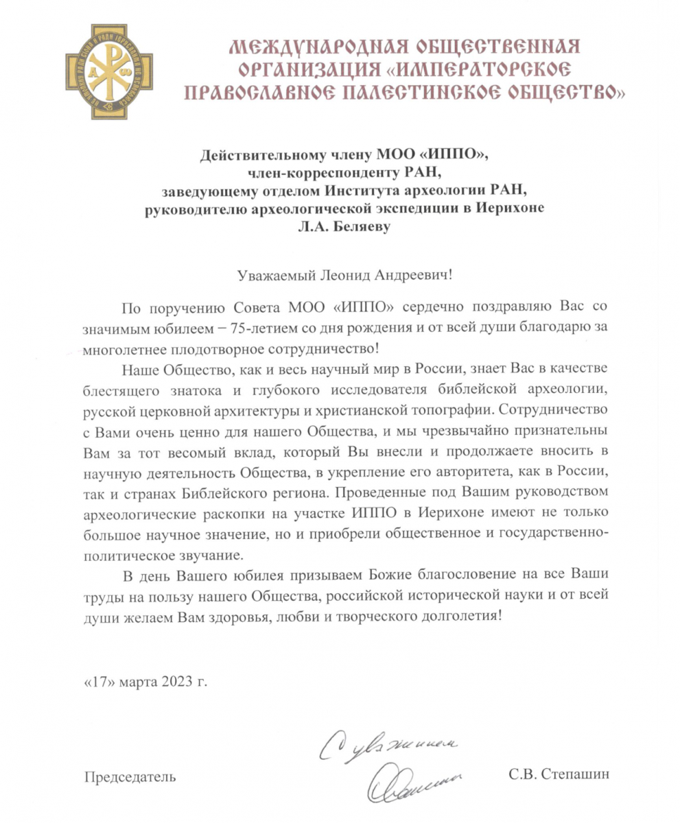 17 марта день рождения отмечает действительный член ИППО, член-корреспондент РАН, заведующий отделом Института археологии РАН, руководитель археологической экспедиции в Иерихоне Леонид Беляев.