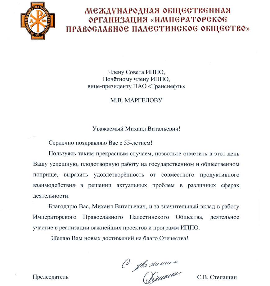 Председатель ИППО Сергей Степашин поздравил Михаила Витальевича с 55-летним юбилеем: