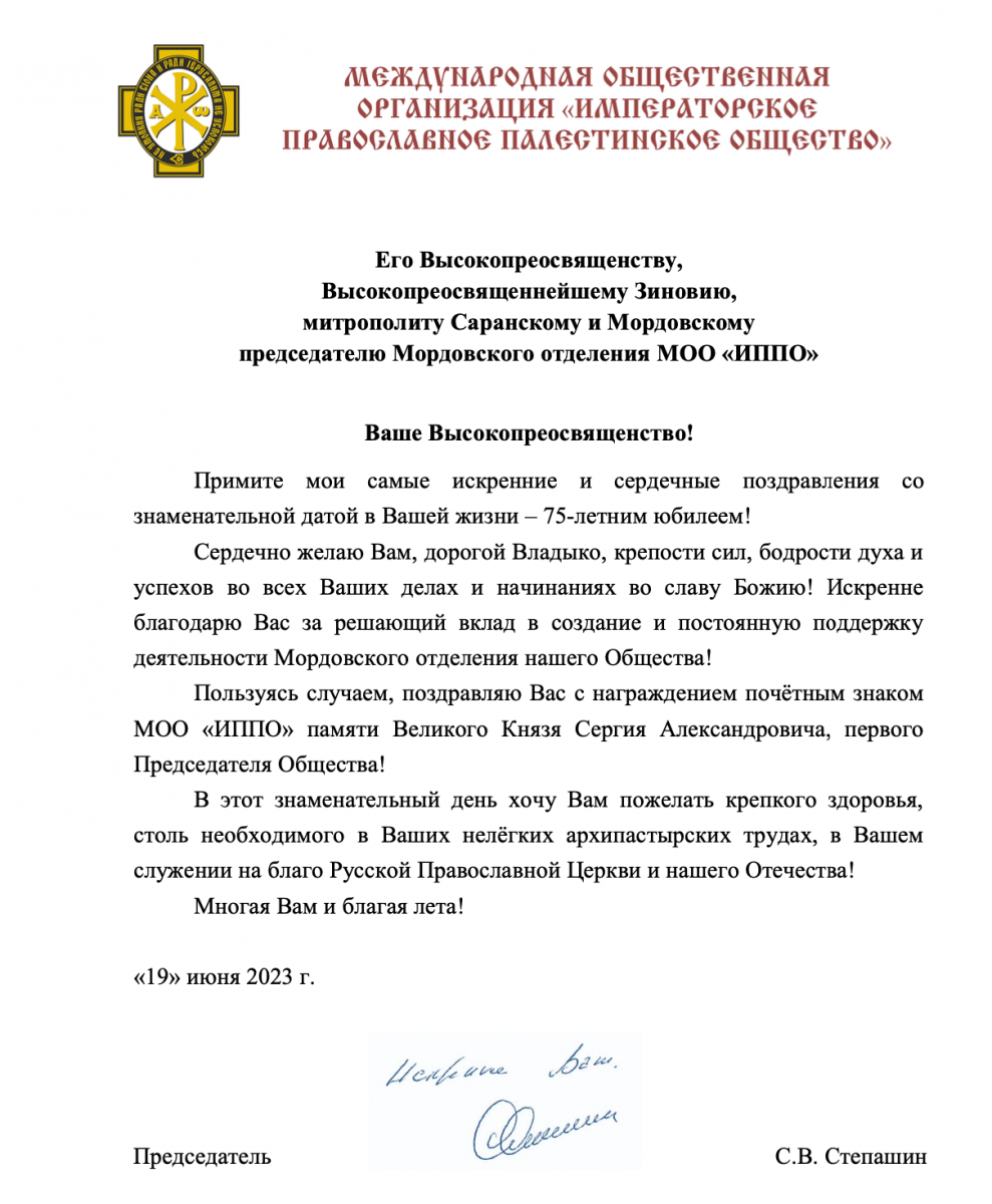 Поздравление в адрес владыки Зиновия направил Председатель Императорского Православного Палестинского Общества Сергей Степашин.