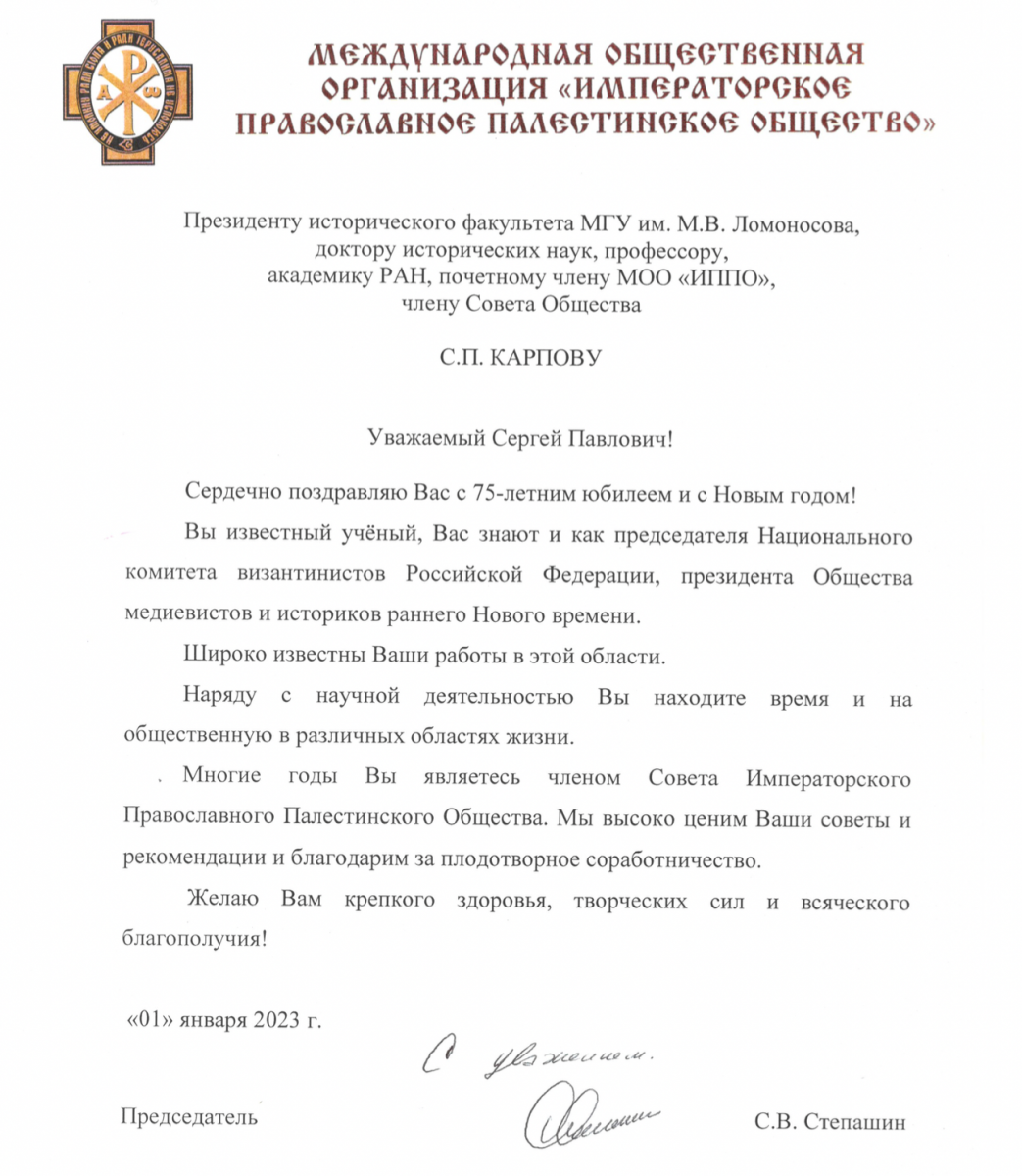 Сегодня 75-летний юбилей отмечает президент исторического факультета Московского государственного университета им. М. В. Ломоносова, доктор исторических наук, профессор, академик РАН, член Совета и Почётный член Императорского Православного Палестинского Общества Сергей Карпов.