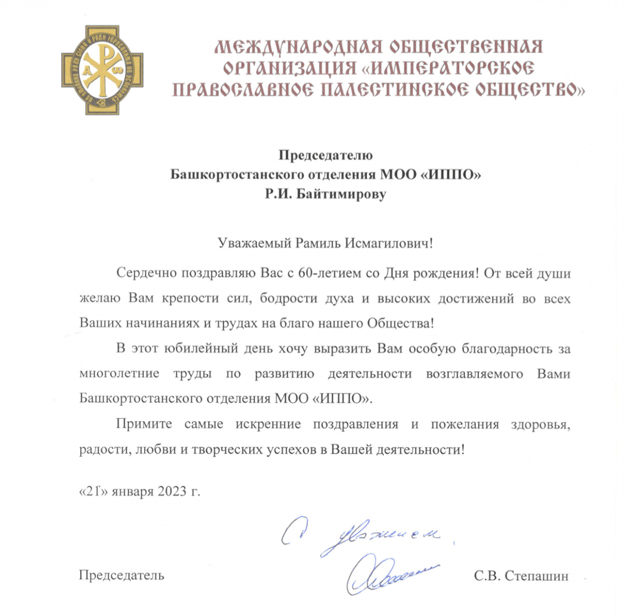 Поздравление в адрес Рамиля Исмагиловича направил Председатель Императорского Православного Палестинского Общества Сергей Степашин.