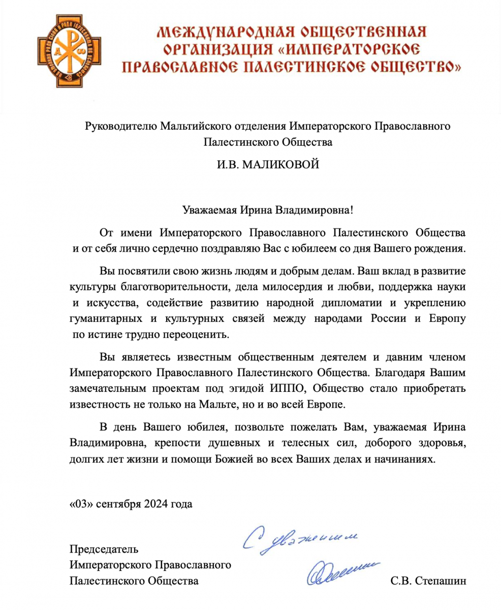 Председатель Императорского Православного Палестинского Общества Сергей Степашин направил поздравление с днём рождения в адрес Ирины Владимировны.