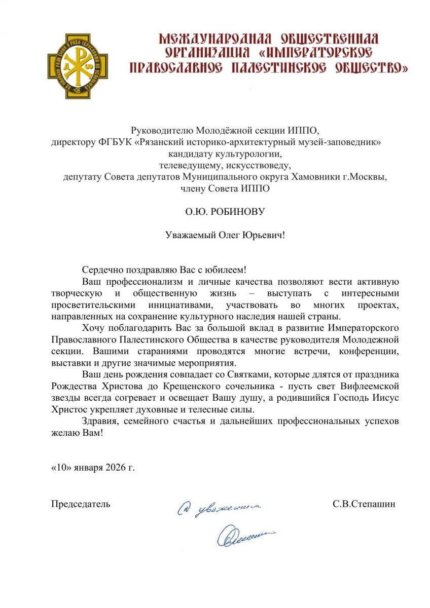 Поздравление в адрес Олега Юрьевича Робинова направил экс-премьер России, Председатель ИППО Сергей Степашин.