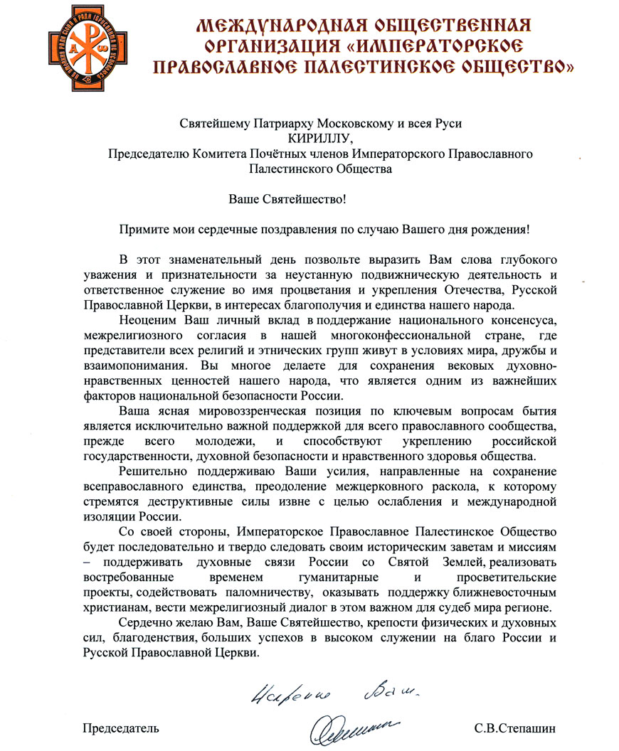 Сергей Степашин направил в адрес Его Святейшества поздравление. В нём говорится: