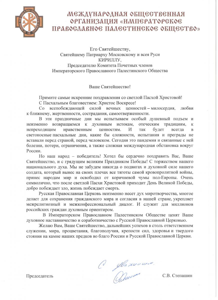 Председатель Императорского Православного Палестинского Общества Сергей Степашин направил поздравление со Светлым Христовым Воскресением Святейшему Патриарху Московскому и всея Руси Кириллу, председателю Комитета Почётных членов ИППО.