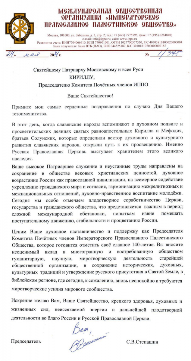 Председатель ИППО Сергей Степашин направил поздравительное письмо в адрес Его Святейшества.