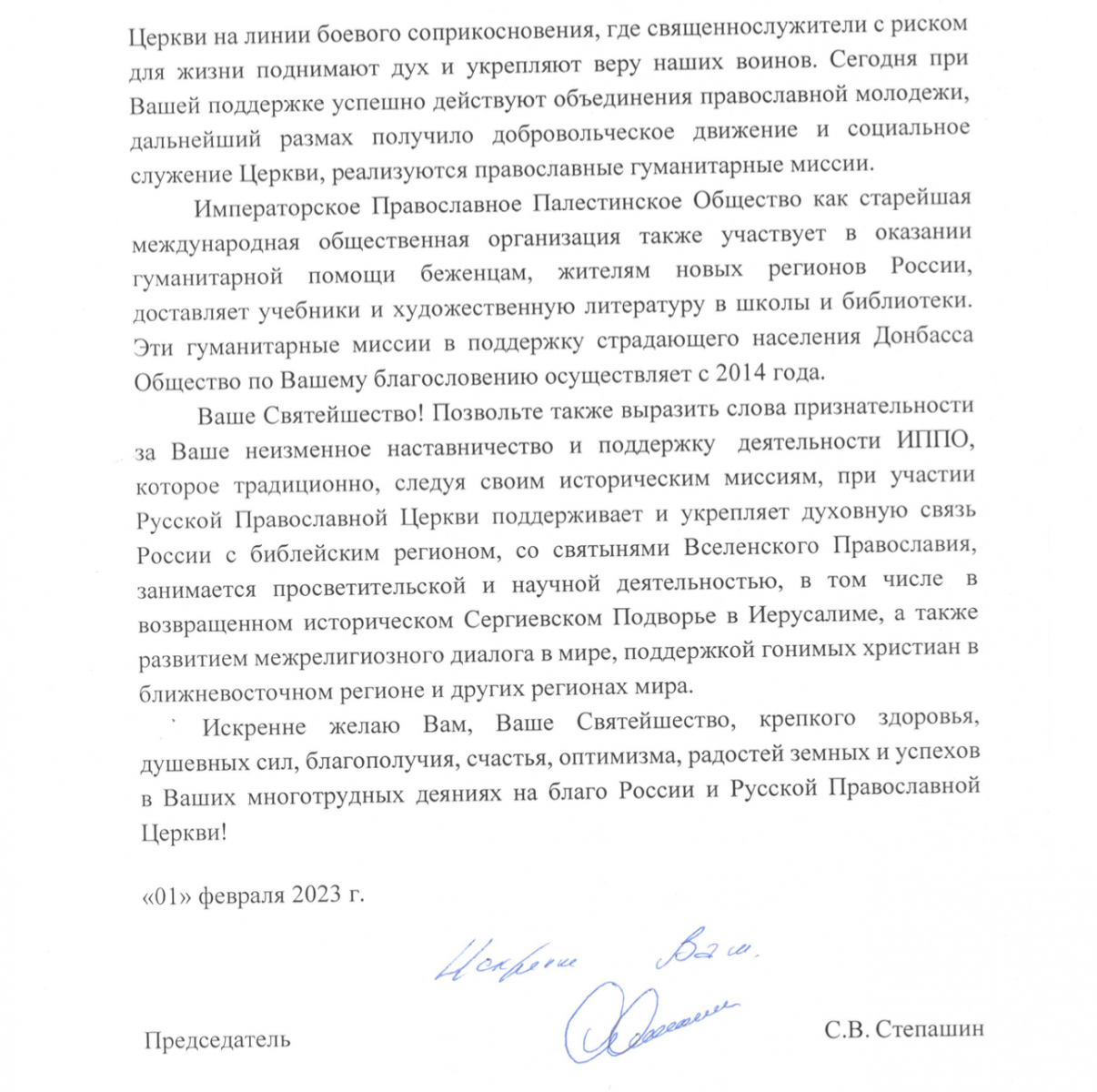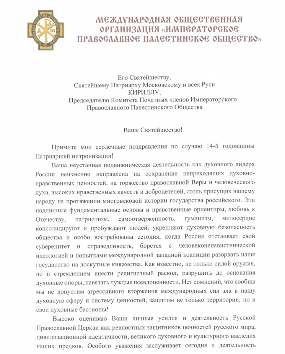 Председатель ИППО Сергей Степашин направил Председателю Комитета Почётных членов ИППО Святейшему Патриарху Московскому и всея Руси Кириллу поздравление по случаю 14-й годовщины Патриаршей интронизации.