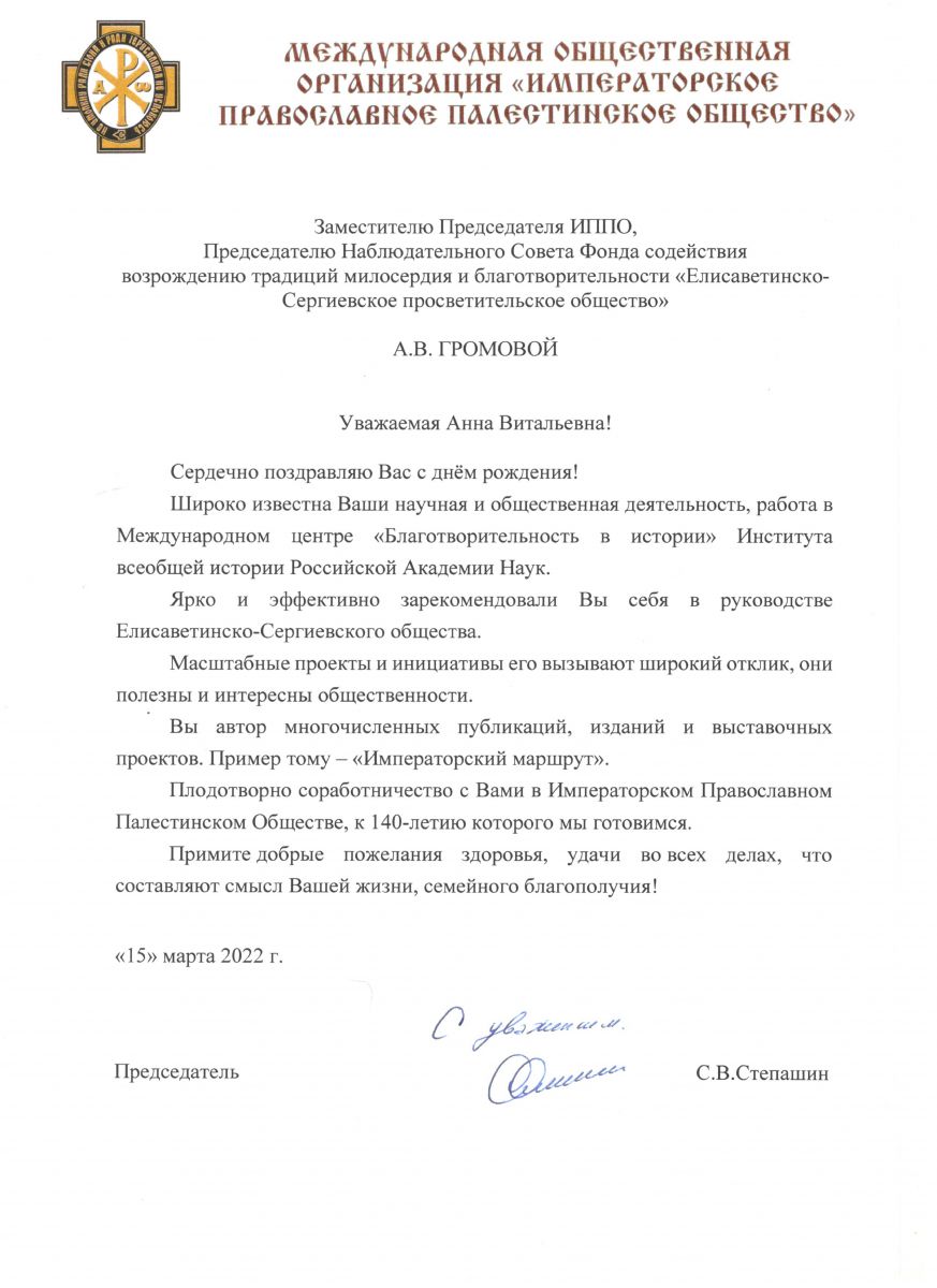 Поздравление в адрес Анны Витальевны направил Председатель Императорского Православного Палестинского Общества Сергей Степашин.